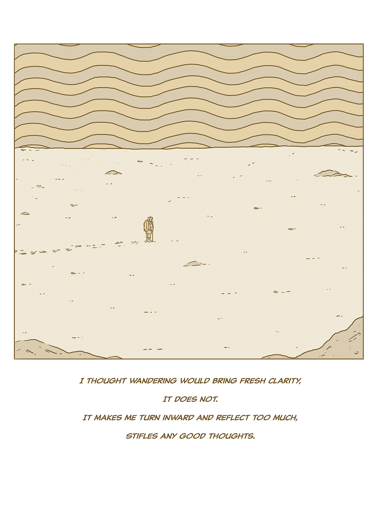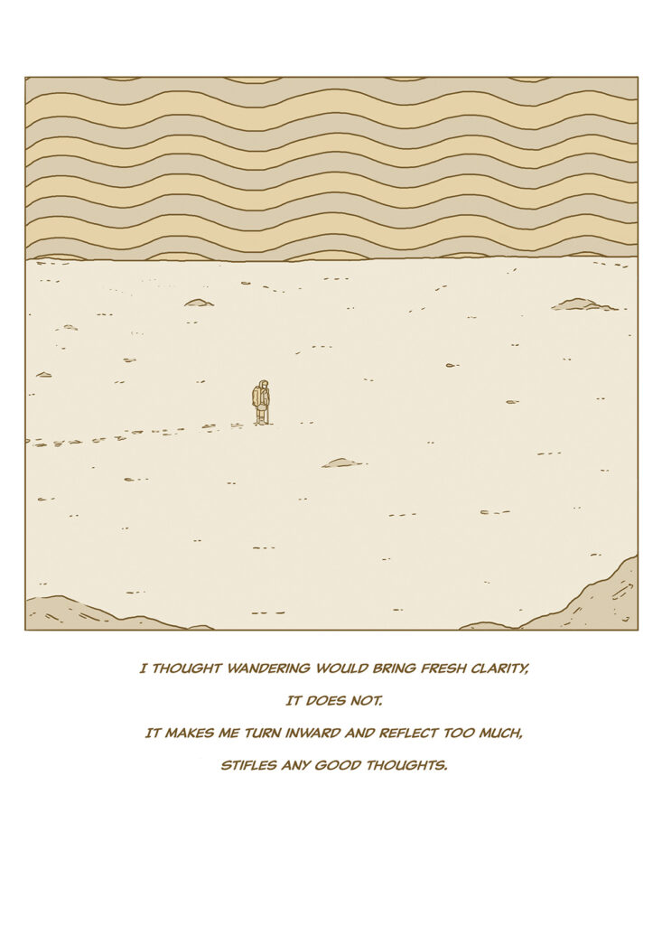 When the everyday becomes overwhelming, our protagonist begins to travel through the world to find wonder and a true escape. As they navigate through the forest, the ocean, the desert, and the mountains in a trip of peace, turmoil and reflection, the narrator encounters mushrooms, sage creatures, whirlpools and learns more about themselves in the process. With gorgeous art and lyrical, contemplative text, this graphic novel is a passage from uncertainty to joy and understanding.